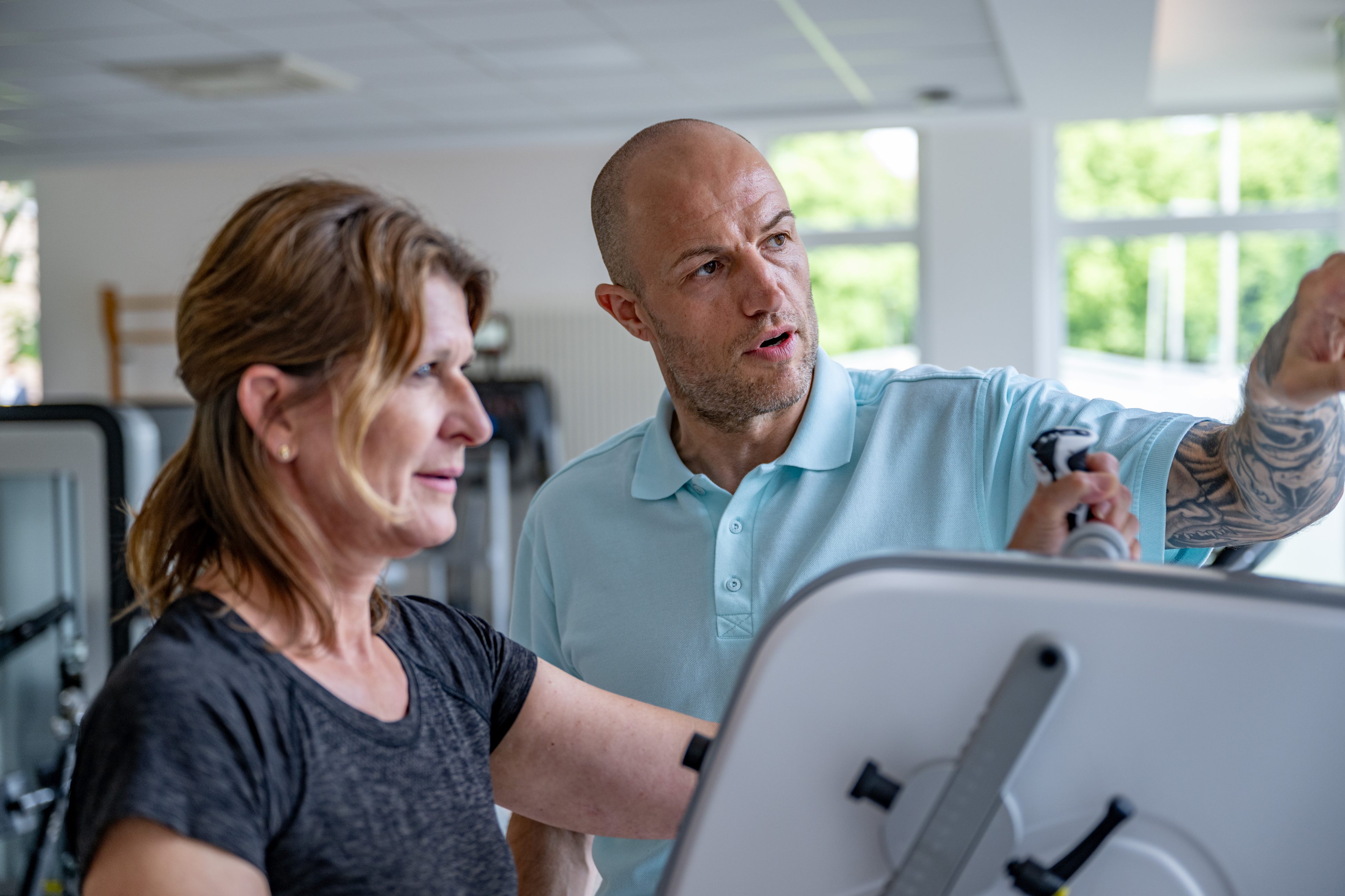 In unserem hellen, 120m² großen Trainingsraum, ausgestattet mit neuen, modernen Proxomed-Geräten, einem Isokinetik-Gerät, einem neuen hochmodernen Laufband, einem neuen Lateralstepper, Rumpfheber, Gehbarren und Sprossenwand lässt es sich wunderbar trainieren und mit den Patientinnen und Patienten arbeiten. Für die Einzeltherapien werden 14 gut ausgestattete Räume vorgehalten. Alle Räume sind vollklimatisiert, damit auch im Sommer das Training Spaß macht.